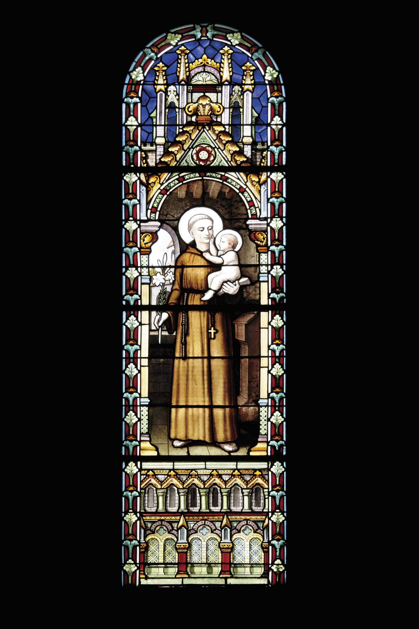 Saint Antoine de Padoue tient un lys blanc et porte l’Enfant Jésus dans ses bras.