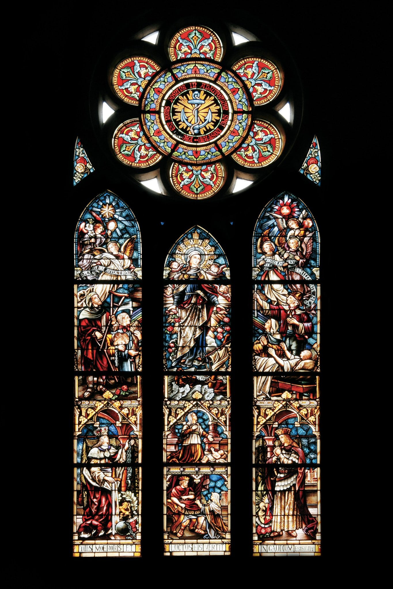 FAD EST NOBIS DOMINA IN ADJUTORIUM SPEI NOSTRAE (dans la rosace en haut) / QUAS FLOS ROSARUM IN DIEBUS VERNIS: (nimbe Vierge) / SPES MEA IN DIE AFFLICTIONIS (lancette de gauche, banderole) / FAIT la FORCE (lancette de gauche, en bas à droite) / ME CONSOLATA EST HEC IN HUMILIA ATE MEA (lancette de droite, banderole) / POST TENEBRAS SPERO LUCEM (lancette de droite en bas) / DIES MOERORIS ET // LUCTUS EIS VERTIT // IN GAUDIUM Esth. XVI 21 (bandeaux sous les trois lancettes)