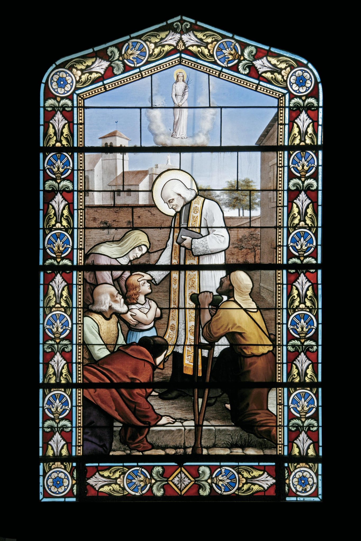 Le Curé d’Ars bénit une petite fille, agenouillée devant lui et accompagnée par sa mère. Un vieillard, un mendiant et un handicapé sont également à ses pieds.