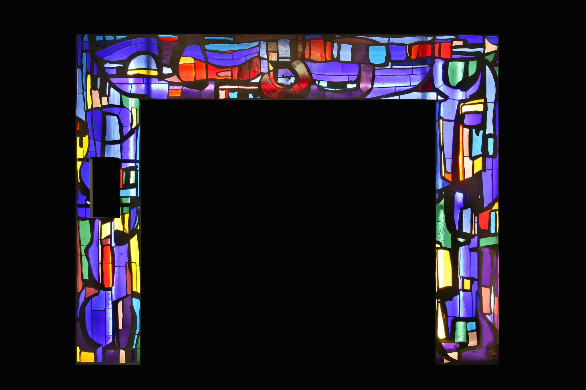 Encadrement décoratif en dalle de verre de la porte d'entrée dans les teintes bleues, vertes, jaunes et rouges.