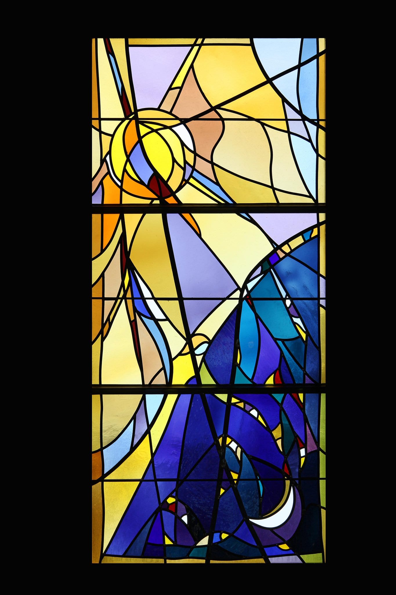 Ce vitrail relate le quatrième jour de la Création du monde. Dieu, à la limite du jour et de la nuit, les bras écartés, a créé le soleil pour dominer sur le jour et la lune pour régner sur la nuit et a distribué les étoiles. Un liseré d’or encadre la scène.