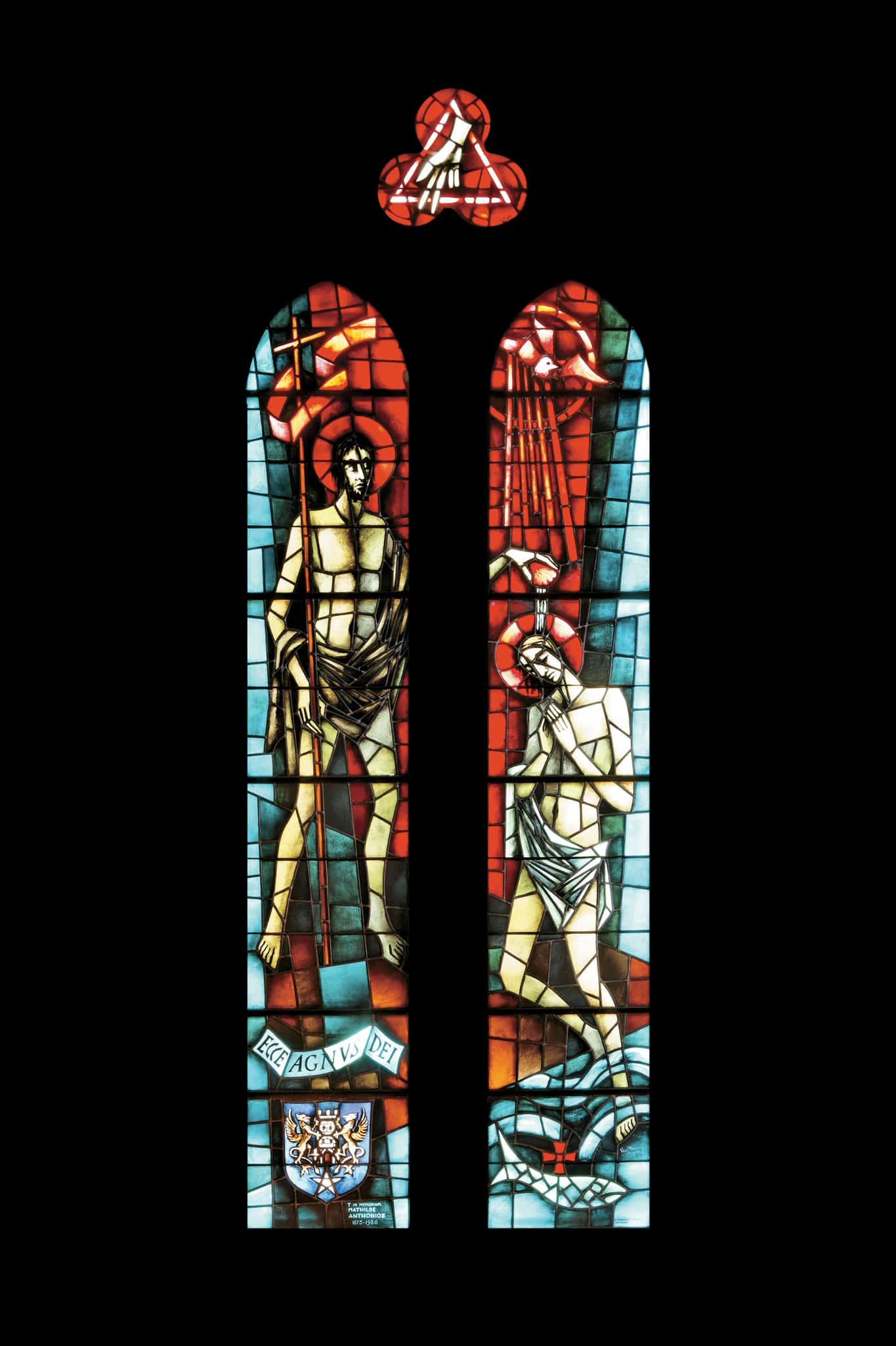 Sur la lancette de gauche, Jean-Baptiste baptise le Christ debout dans les eaux du Jourdain (lancette de droite) alors que la colombe du Saint-Esprit descend sur lui. En bas dans la lancette de gauche, les armes du donateur. Dans le trilobe en haut la main de Dieu est inscrite dans le triangle symbolisant la Trinité.