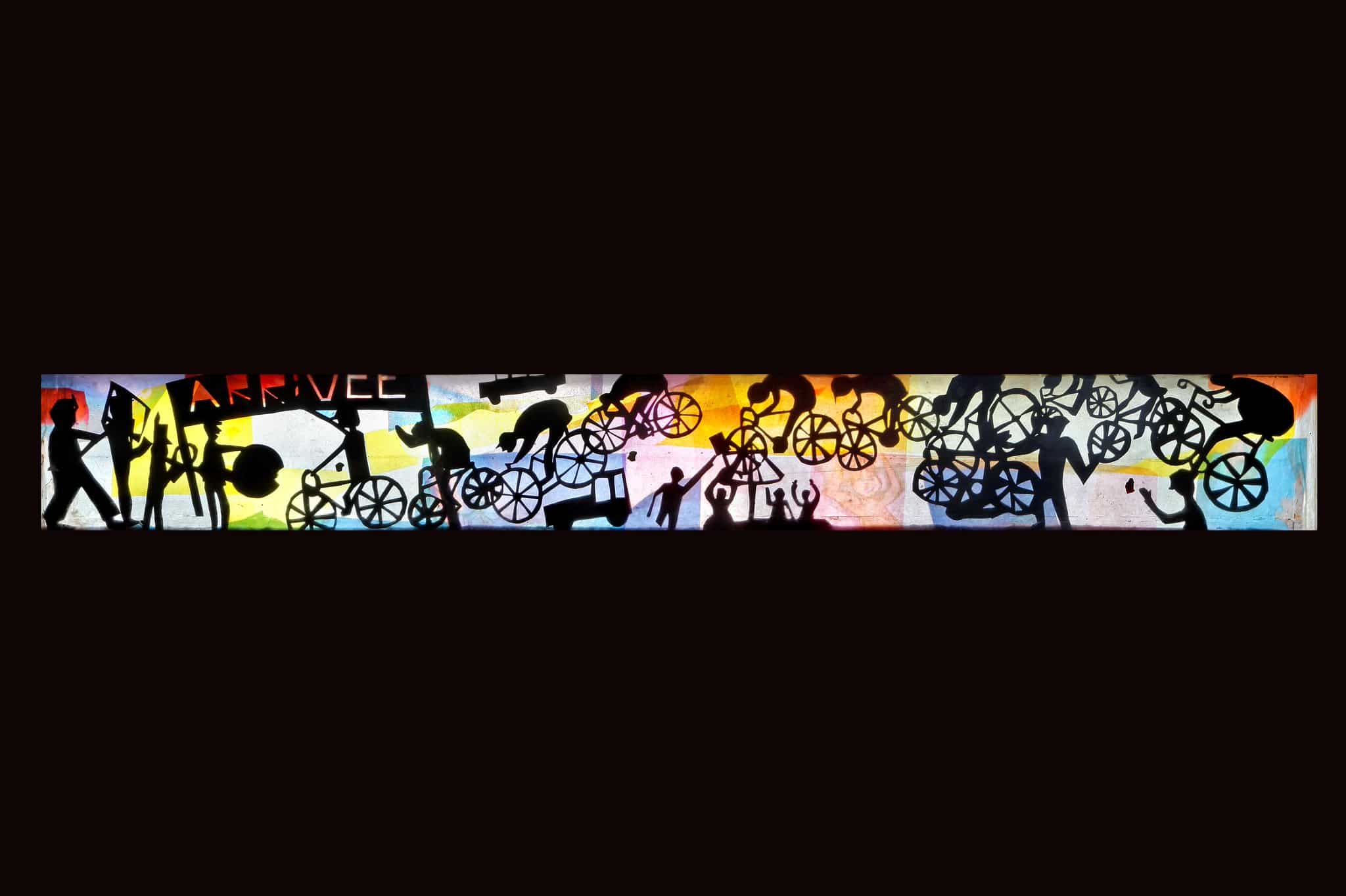 Des coureurs cyclistes s’apprêtent à franchir l’arrivée accueillis par des spectateurs et une fanfare. Le tout sur fond bleu, orange, jaune et blanc.
