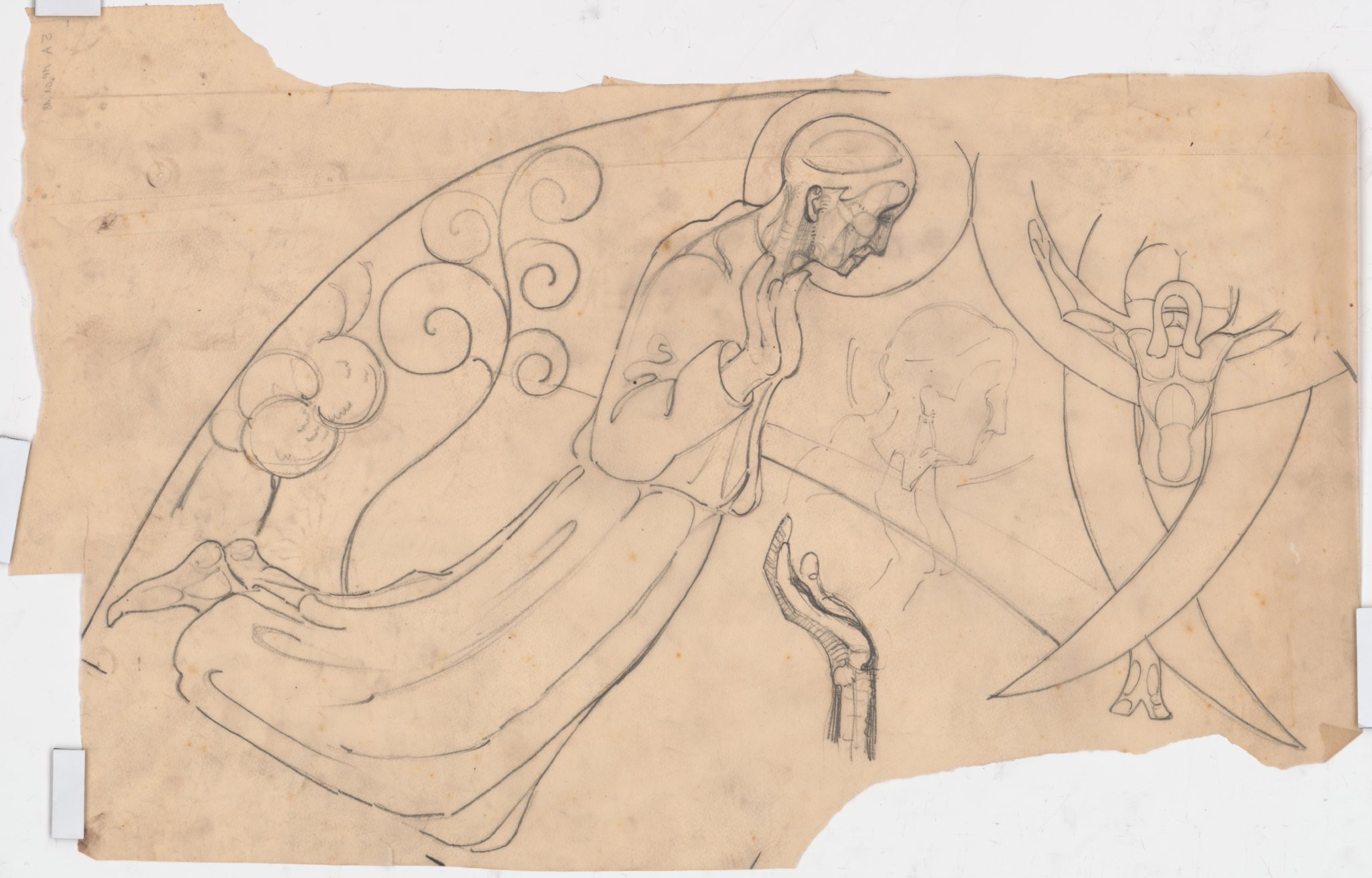 Trois oeuvres graphiques peuvent être reliées à la scène supérieure du vitrail (MP_01.17 ; MP_01.18 ; MP_01.19). Sur celle-ci, Poncet envisage différents éléments de sa composition, notamment le saint et le séraphin, montrant un aspect déjà proche du résultat final. Il devait probablement exister, comme pour les autres vitraux, des dessins antérieurs où les protagonistes étaient plus esquissés. Poncet dessine ici deux fois la tête du saint et étudie également l'anatomie de sa main, en dessinant la position de ses muscles et de ses articulations. Cette démarche manifeste le travail consciencieux d'un jeune artiste tout juste sorti des Beaux-Arts.