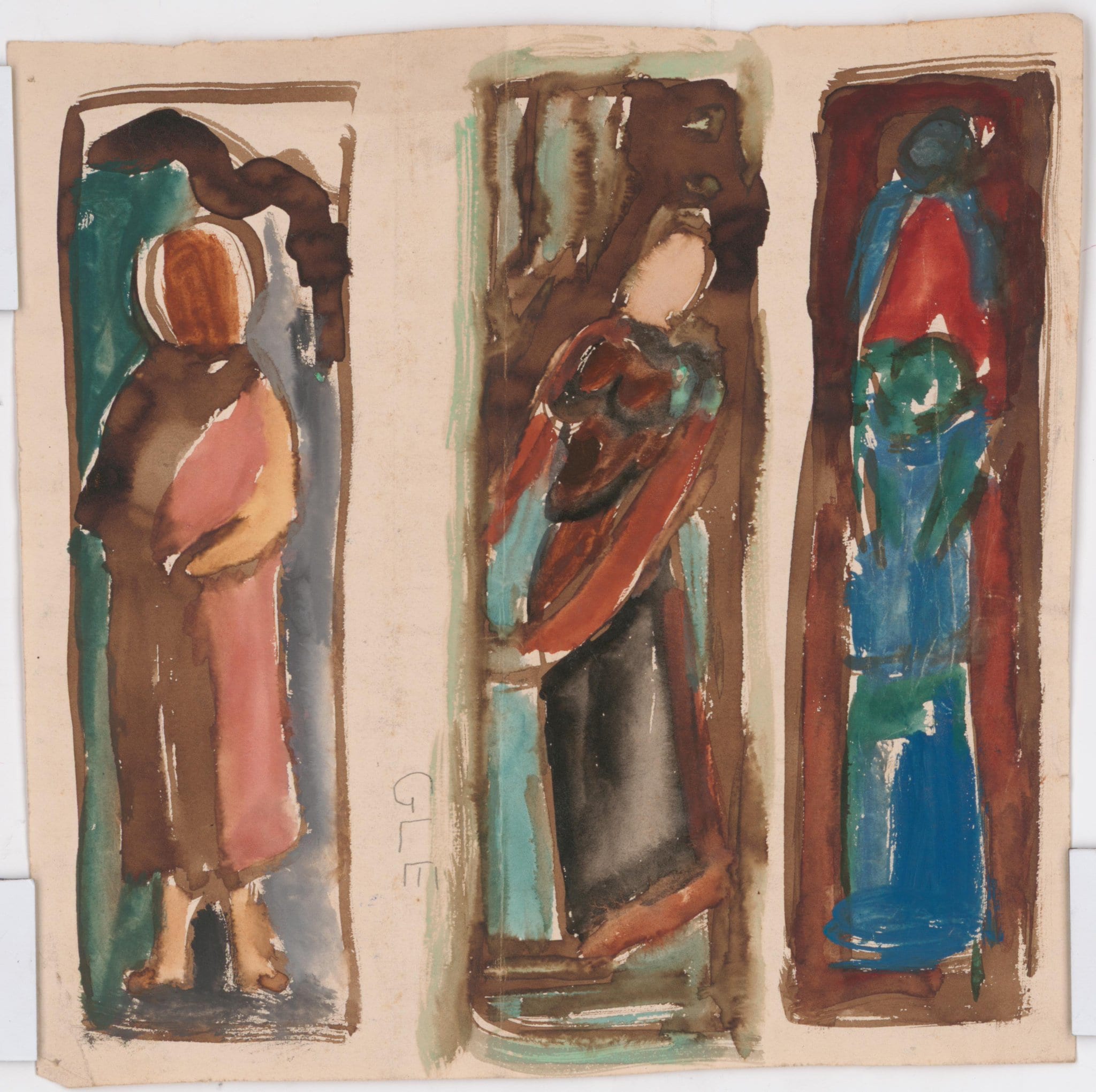 Trois figures en pied inscrites dans des rectangles. Celle de gauche est vêtue d'un ample vêtement rose, celle du centre semble féminine et porte un vêtement brun et noir. La figure de droite est traitée dans les tons rouges bleus et verts.