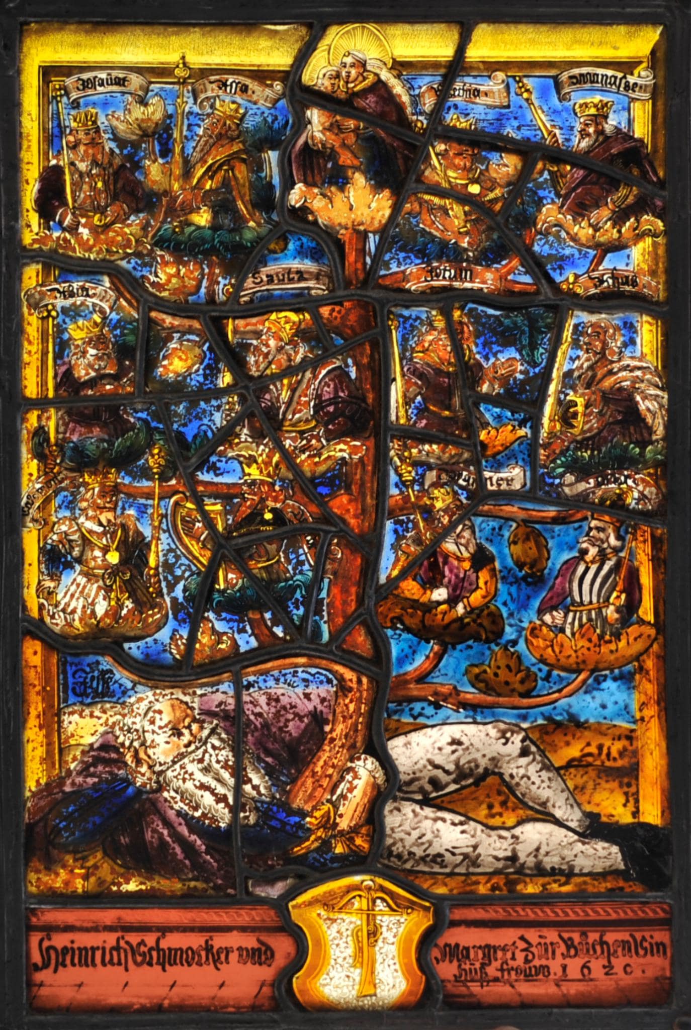 Die Scheibe zeigt den vor blauem Grund am Boden liegenden Jesse, aus dem der Baum mit den Vorfahren Christi wächst. In der Baumspitze ist das Christkind im Schosse Mariens festgehalten. Die Darstellung wird seitlich und oben von einer gelben Leiste umfasst. Die Stifterinschrift mit dem Wappen Heinrich Schmockers im Zentrum befindet sich am Scheibenfuss.
