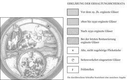 In der oberen Hälfte der Rundscheibe ist die Verstümmelung des Kanaanitischen Königs Adoni-Besek durch die Israeliten festgehalten. Die rahmende Ornamentbordüre nimmt im Scheitel die Nennung der Bibelstelle auf (Ri 1). Die untere Hälfte füllt das umkränzte, von der Banderole mit dem Stifternamen umflatterte Vollwappen Christoph von Diesbachs.
