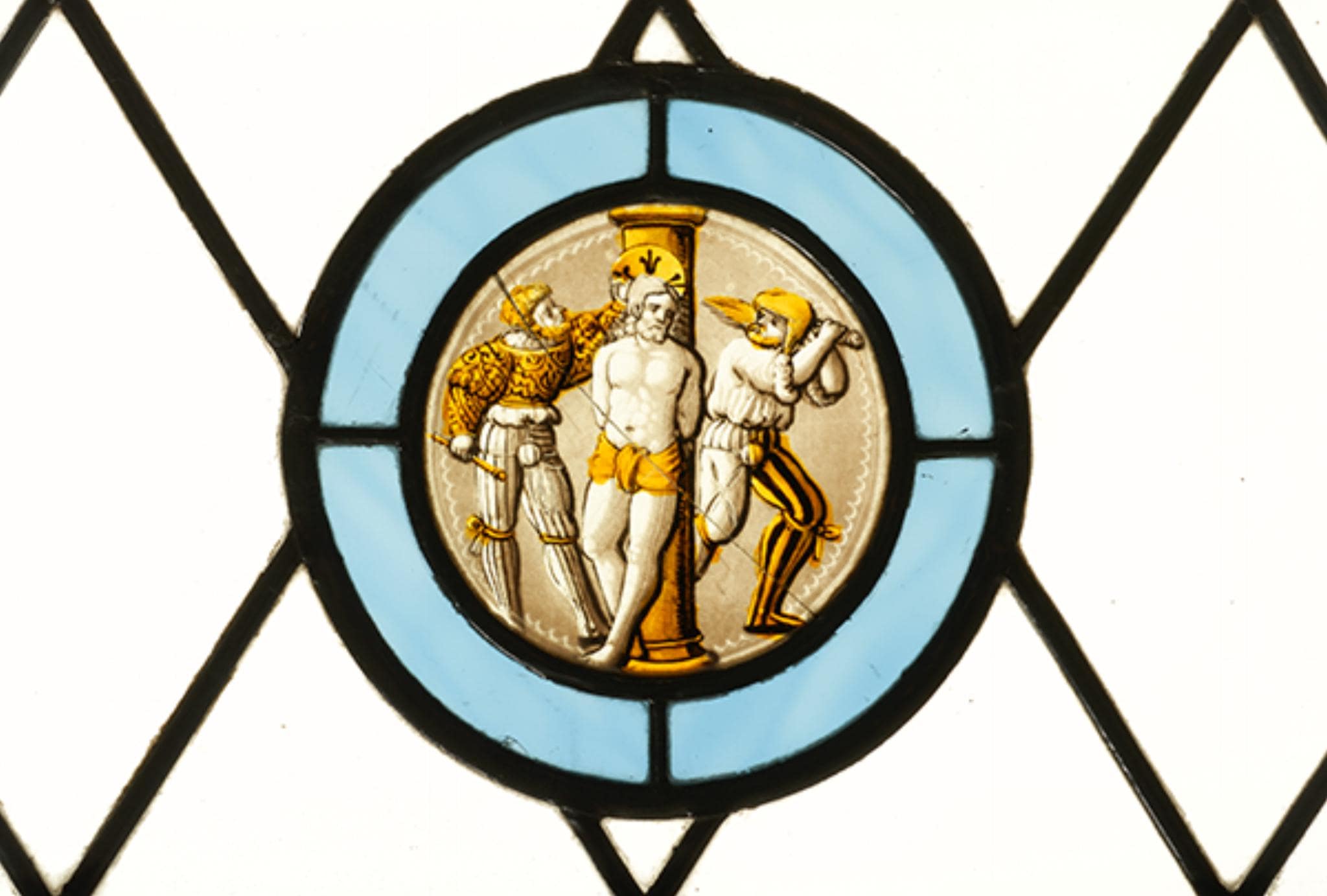 Die in Grisaille- und Silbergelbmalerei ausgeführte runde Monolithscheibe zeigt die Geisselung Christi vor einheitlich hellbraunem Grund. Vor der breiten, das Glasgemälde in zwei Hälften teilenden Säule steht Christus im Lendenschurz und mit im Rücken gefesselten Händen und ist der Willkür zweier Schergen ausgesetzt. Der linke Scherge hält einen Stock in der Rechten und greift mit der Linken in das Haar des Gepeinigten, der rechte schwingt über der Schulter die Geissel.