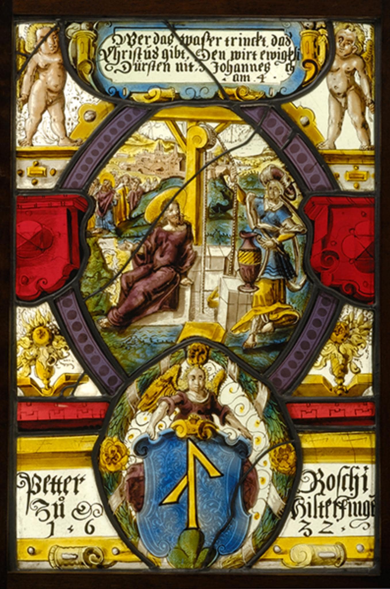 Das Hauptbild zeigt Christus und die Samariterin am Brunnen (Jo 4, 1–30). Es wird von einer ovalen, violetten Leiste umfasst, die seitlich zum Scheibenrand hin mit je einem roten Rollwerkelement besetzt ist. In den Zwickelfeldern darüber stehen zwei Putten, die gemeinsam die blau-gelbe Rollwerkkartusche mit der Bildlegende halten. Die beiden unteren Zwickelfelder sind mit Blumenvasen dekoriert. Das hohe Podium am Scheibenfuss enthält den Stifternamen. In der Mitte ist ihm ein Ovalkranz aufgesetzt, in dem ein Engel das Wappen Peter Roschis präsentiert.