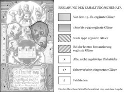 Vor farblosem Grund erhebt sich das mit zwei Helmzierden besetzte Vollwappen des Christoph von Luternau. Dahinter dient ein Engel als Schildhalter. Der Wappenschild ruht auf der die Stifterinschrift enthaltenden gelben Rollwerkkartusche, auf der zwei Vögel stolzieren. Die ganze Bogenrahmung ist aus Flickstücken zusammengefügt.