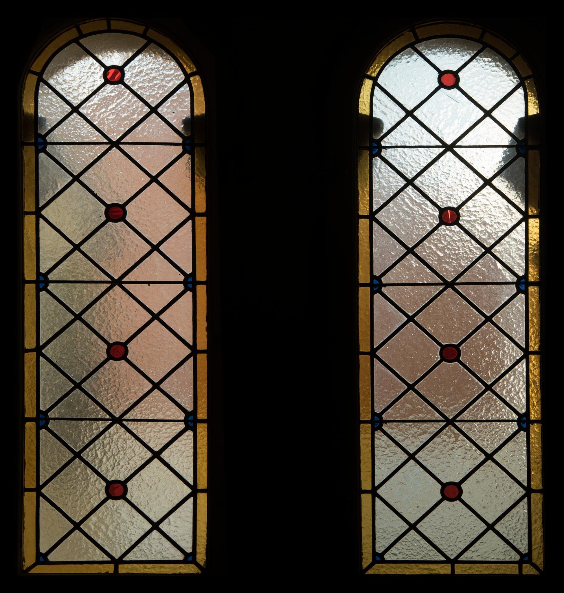 Ce vitrail ornemental à double lancettes est composé de losanges avec une bordure jaune. Des ronds rouges et demi-ronds bleus animent le centre.