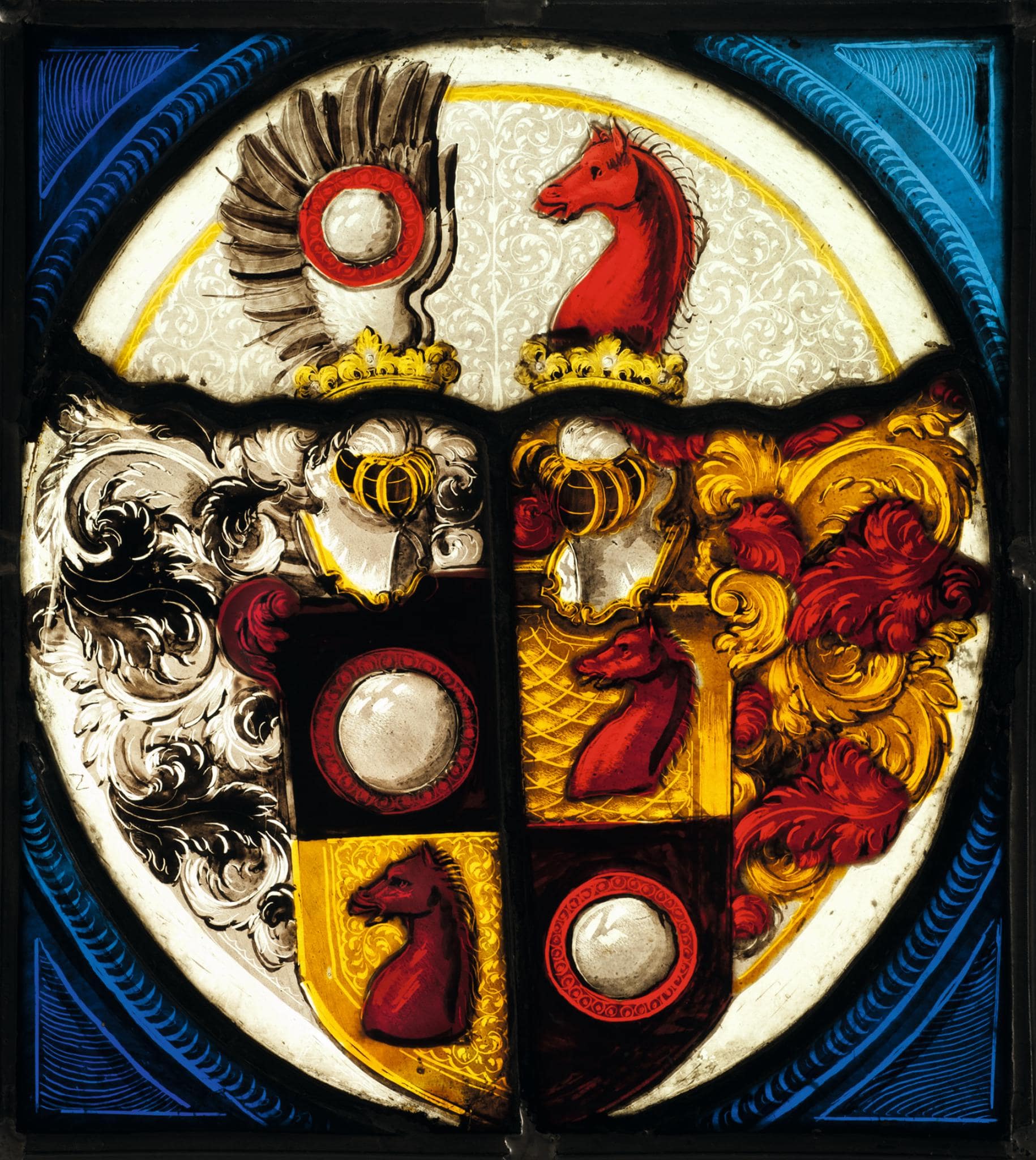 Das ursprüngliche Wappen mit dem einzelnen, rot gerahmten Spiegel wurde 1563 vermehrt und mit dem Pferderumpf, dem Wappenschild der ausgestorbenen Praun, geviert (Kaiser Ferdinand I. verlieh dieses Wappen am 9.12.1563 David von Lengheim, dem nächsten Blutsfreund Prauns, und Hans Stubich. S. Zahn/Siegenfeld 1893. S. 68. Ich danke Christina Wais in Wien für ihre freundliche Hilfe bei der Beschaffung des Steiermärkischen Wappenbuchs). Die Wappenscheibe ist sicher mit dem Grafen Adam von Lengheim († 1585) zu verbinden. Er erwarb 1578 die Burg Bertholdstein in Pertlstein (Sie blieb bis 1794 im Besitz der Familie, die 1835 im Mannesstamm ausstarb. Am Portal befindet sich der 1582 datierte Wappenstein Adam von Lengheims, der in Trautmannsdorf beigesetzt wurde, wo ein Spätrenaissance-Epitaph an ihn erinnert. Freundliche Hinweise von Barbara Giesicke, Badenweiler) von Policarp Stürgkh und 1583 die Burg Kapfenstein von Hans von Weisseneck. Adam war mit Helena von Weisseneck († 1584) verheiratet. Dem Ehepaar ist die folgende Wappenscheibe (VMR_166_FR_310) zuzuweisen, welche im dritten und vierten Wappengeviert die Schildbilder der Weisseneck aufnimmt.