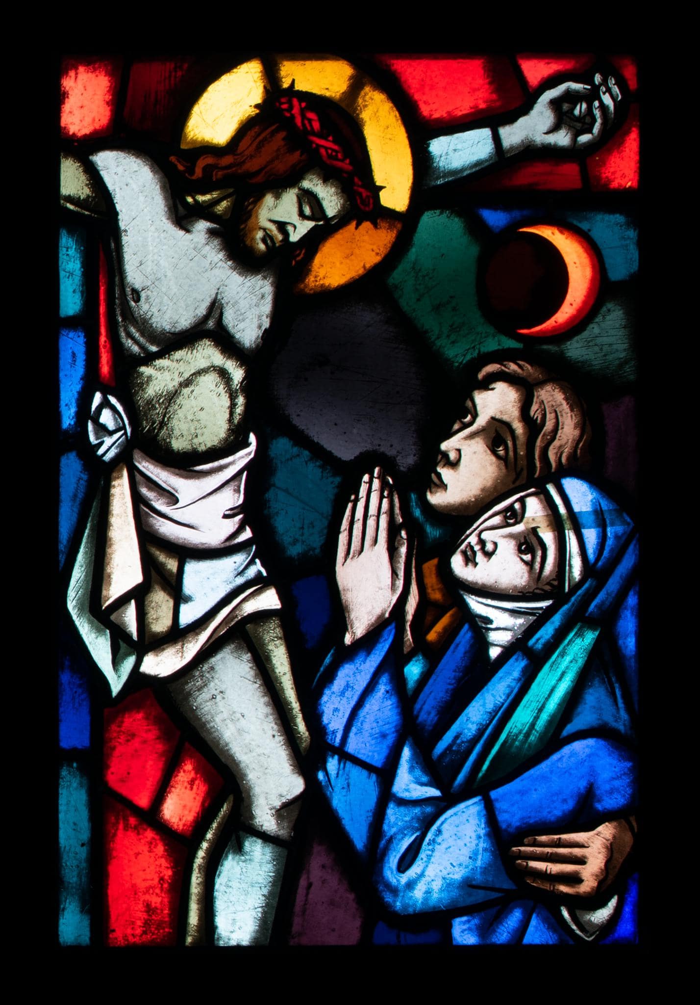 In vierzehn schmalen, in farbige Rechtecke gegliederten Rundbogenfenstern ist ein Kreuzwegzyklus dargestellt. Die Intensität der Farben nimmt nach unten zu. Christus stirbt am Kreuz, neben ihm stehen Maria und Johannes der Evangelist.