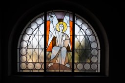 Dreigeteiltes Rundbogenfenster mit Christus im mittleren Feld, der aus dem Grab aufersteht und in den Himmel auffährt, symbolisiert als gelb-oranges Farbfeld. Die Wundmale (Stigmata) Christi sind aus tropfenförmigem gelbem und orangefarbenem Glas geformt; das Wundmal auf der Brust aus Überfangglas. Das Fenster besteht aus farblosem Strukturglas und einem breiten umlaufenden Ornamentband aus opak weissen Kreisen auf gelbem Grund.
