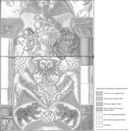 Vor blau-schwarzem Hobelspandamast heben zwei Löwen über den beiden einander zugeneigten Bernschilden den Reichsschild mit dem goldenen Spangenhelm empor, auf dem sich der in seinen Krallen den Reichsapfel haltende Reichsadler niedergelassen hat. Die Komposition wird seitlich von massigen Rundpfeilern mit dunkelblauen Basen und grünen Kapitellen gerahmt. Der sich darüber erhebende rankenverzierte Bogen ist ebenso wie der Reichsadler oben beschnitten.