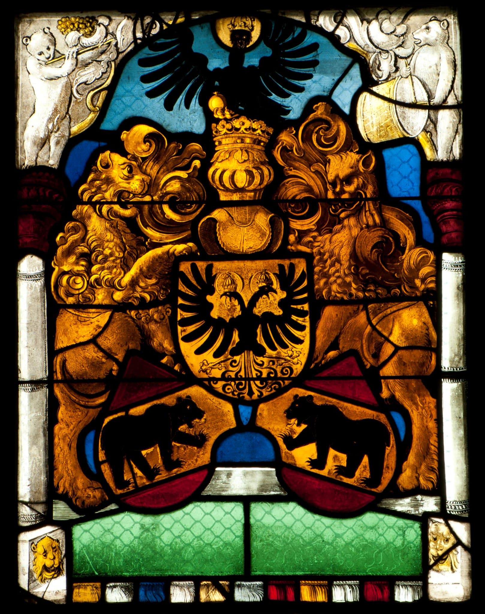 Vor blauem Grund steht die von zwei Löwen gehaltene Wappenpyramide Bern-Reich. Ihr oberer Abschluss bildet der auf dem bekrönten Wappenhelm sitzende Reichsadler mit dem Reichsapfel in der Kralle. Darüber schwingt sich ein zierlicher Astbogen mit Blattwerk. Dieser ruht auf den roten Kapitellen der die Seitenrahmung bildenden schlanken Säulen. Auf den Kapitellen stehen zwei Bären, die mit Pfeife bzw. Trommel musizieren. Die Säulenbasen in den unteren Ecken schmücken Löwenmasken. Der grüne Teppich unterhalb der Bernschilde ist erneuert.