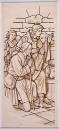 Ce carton en noir et blanc est le modèle précis à l’échelle 1:1 de la partie figurée du vitrail consacré à saint Pierre situé à gauche du vitrail axial dans le choeur de la nouvelle église Sankt Stephan au Jaun. Toute la partie décorative manque mais la forme de l’ouverture est indiquée avec précision.