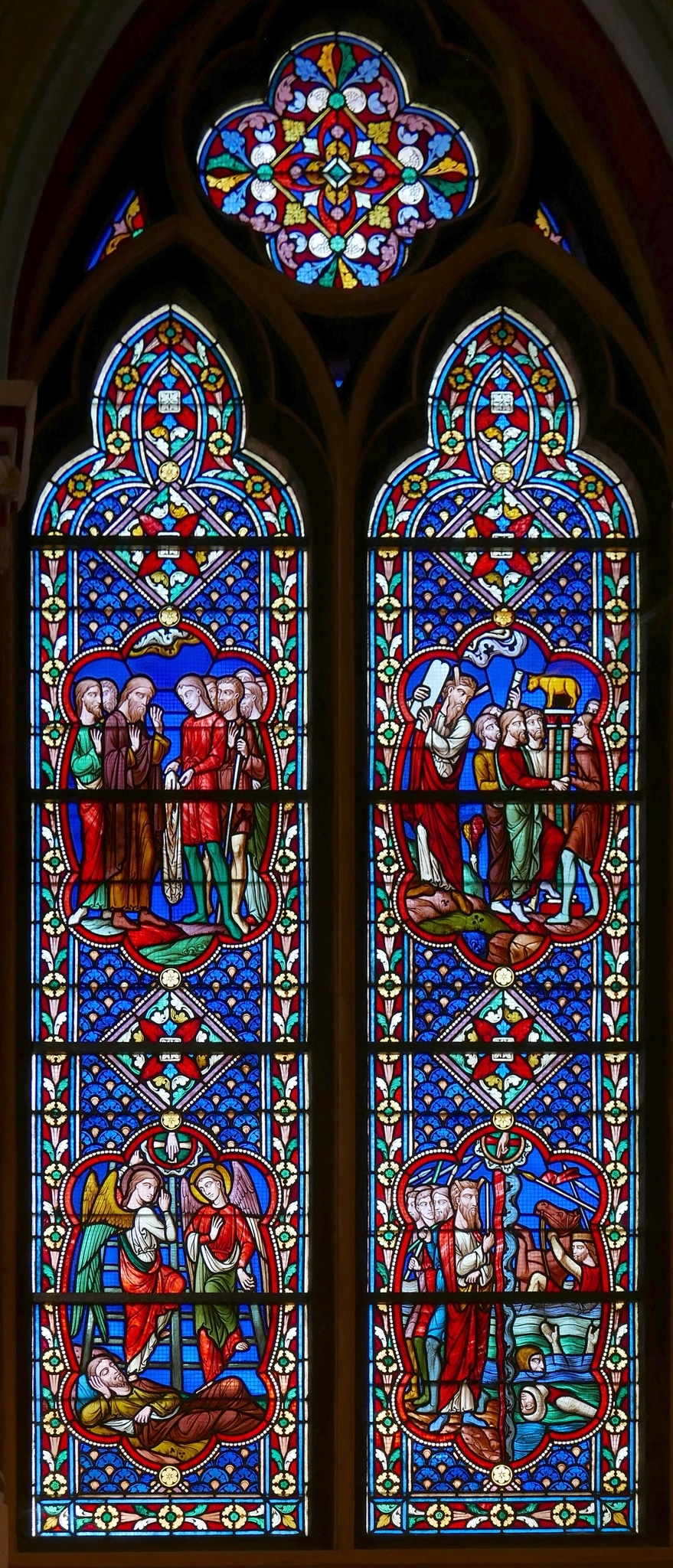 Masswerkfenster mit zwei in Nonnenköpfen endenden Lanzetten; darüber Vierpass als Couronnement. Beide Lanzetten enthalten zwei Medaillons mit Bildszenen, die von unten nach oben gelesen werden. Links unten ist der schlafende Jakob gezeigt, der im Traum die Himmelsleiter sieht, auf der Engel hoch- und niedersteigen (Gen 28, 10–15). Eine Hand in einem Kreuznimbus symbolisiert den Herrn, der zu Jakob spricht. Darüber ist dargestellt, wie Jakob das Gewand seines Lieblingssohnes Joseph erkennt, den ein Raubtier getötet haben soll, der tatsächlich aber von seinen Brüdern nach Ägypten verkauft wurde (Gen 37, 12–36). Das Medaillon rechts unten zeigt Moses, der die Flucht der Israeliten aus Ägypten anführt. Er hat mit seinem Stab das Rote Meer geteilt und sein Volk hindurchgeführt; nun schliesst er das Meer über dem Heer des Pharaos (Ex 14). Darüber ist zu sehen, wie die Israeliten das goldene Kalb anbeten, als Moses mit den Gesetzestafeln in den Händen vom Berg Sinai zurückkehrt (Ex 32).