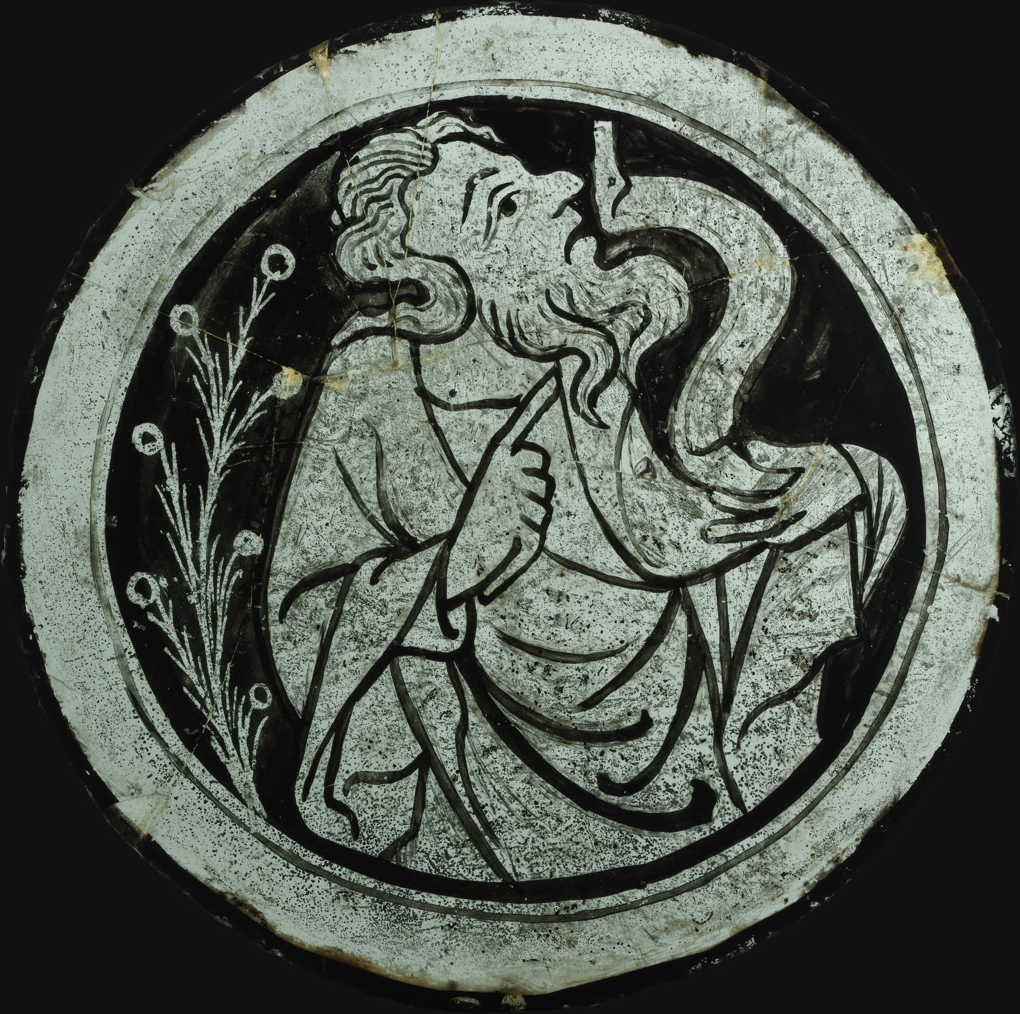 Le peintre verrier et la localisation d’origine des médaillons ne sont pas identifiés. Selon Lapaire (1980, p. 26), la couleur du verre utilisé et le traitement minutieux de la grisaille rappellent certains médaillons décoratifs insérés dans les fenêtres du choeur de l’abbatiale Saint-Ouen de Rouen, datés aux alentours de 1325. La baie dédiée à la légende de saint André y est par exemple ornée de plusieurs rondels figurant des monstres et des grotesques (Lafond, 1970, p. 42, baie 36, planches 10 et 11). Les vitraux de l’Ariana agrémentaient peut-être eux aussi à l’origine des verrières monumentales figuratives (Lapaire, 1980, p. 27).
