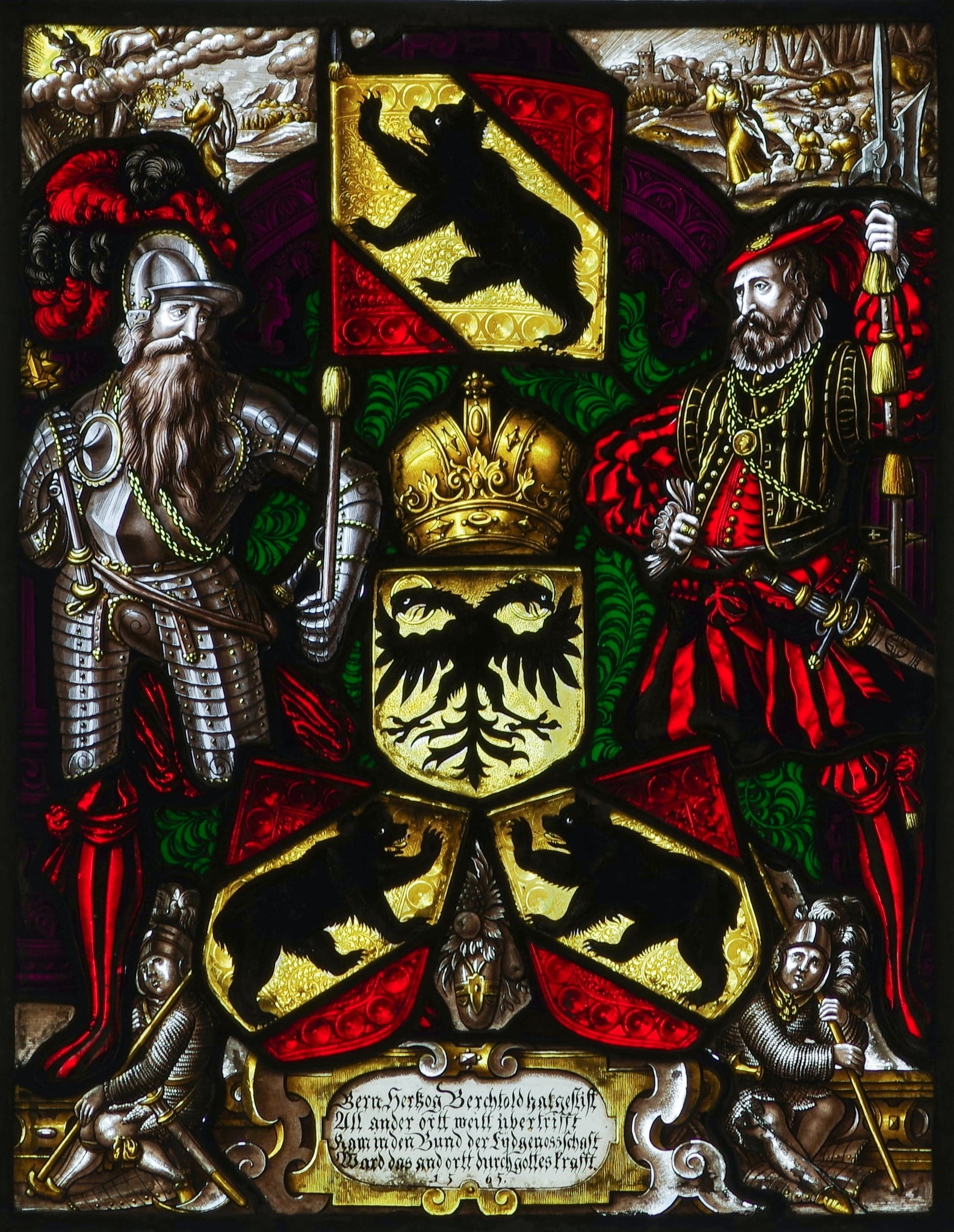 Bern, hertzog Berchtold hat gestift / All ander ortt weitt übertrifft / Kam in den Bund der Eÿdgnossschaft / Ward das and ortt durch gottes krafft. / .1565. (en bas dans le cartouche)