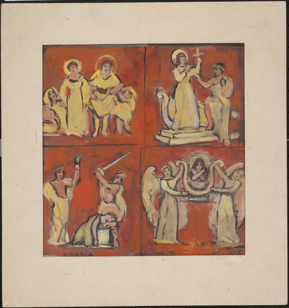Ce travail préparatoire a été réalisé en 1935 par l’artiste Alexandre Cingria pour la rose de la tribune de l’église Saint-Michel de Sorens. Composé de quatre parties figurant les scènes figurées de la rose autour de la figure de sainte Cécile, qui ont été réunies sur un même support en vue de leur vente, comme le suggère l’inscription au verso du passe-partout.